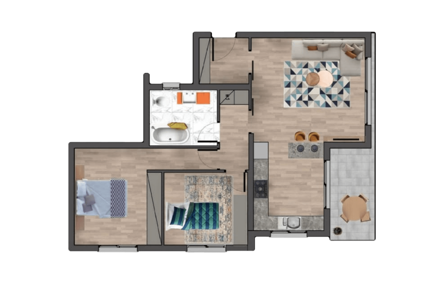 две спальни и кухня-гостиная площадь 79 м2 один санузел терраса 15 м2