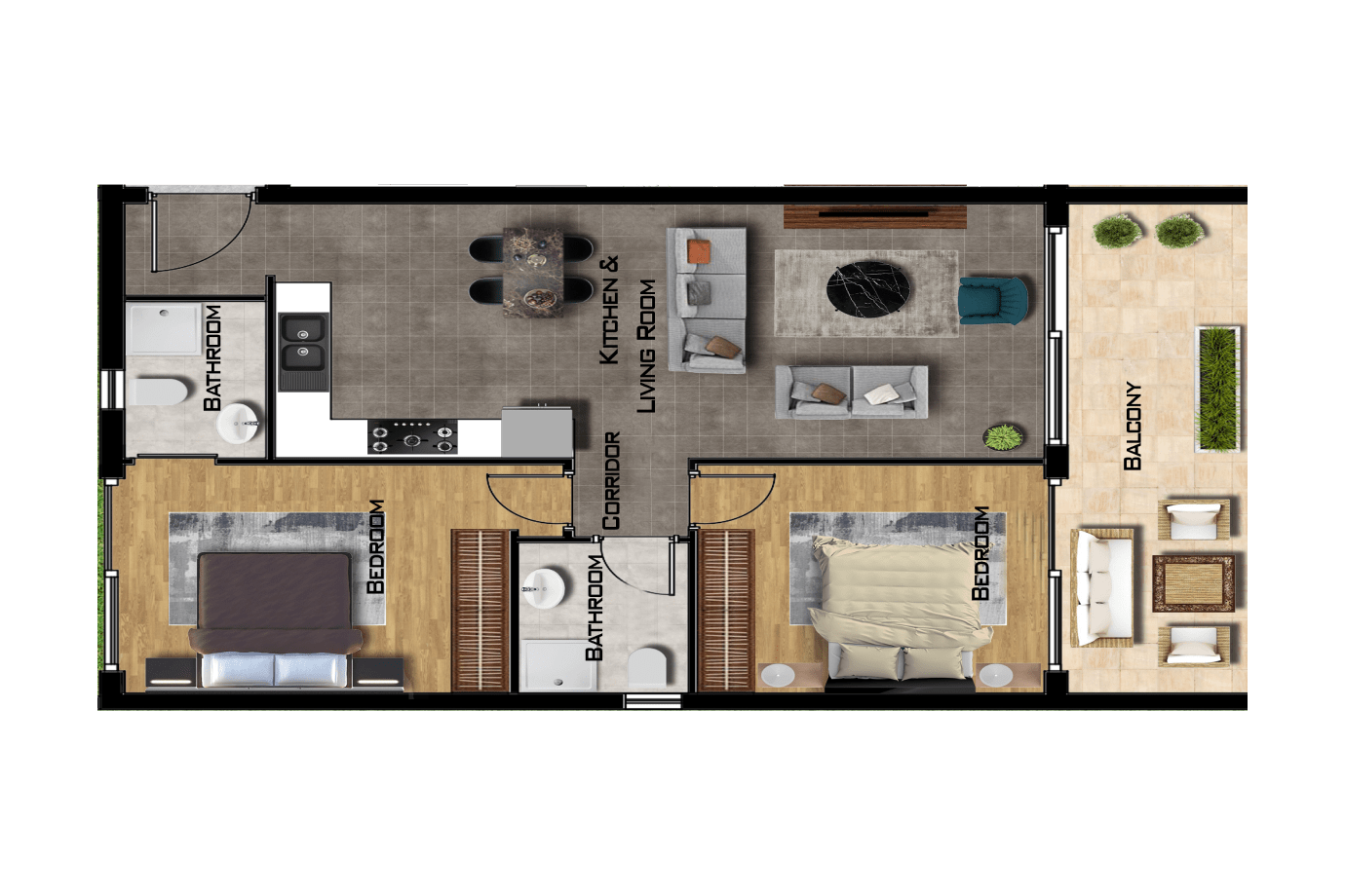 На территории комплекса будет построен большой общий бассейн и разбиты вечнозеленые сады. В быстрой транспортной доступности от проекта находится вся повседневная инфраструктура, включая детские сады, школы и университет. | | | | | | | рассрочка до 24 месяцев под 0% | | | | проект сдается в сентябре 2025 года | | | | | | Апартаменты 1+1 | | 1спальня и кухня-гостиная площадь 55,2 м2 один санузел