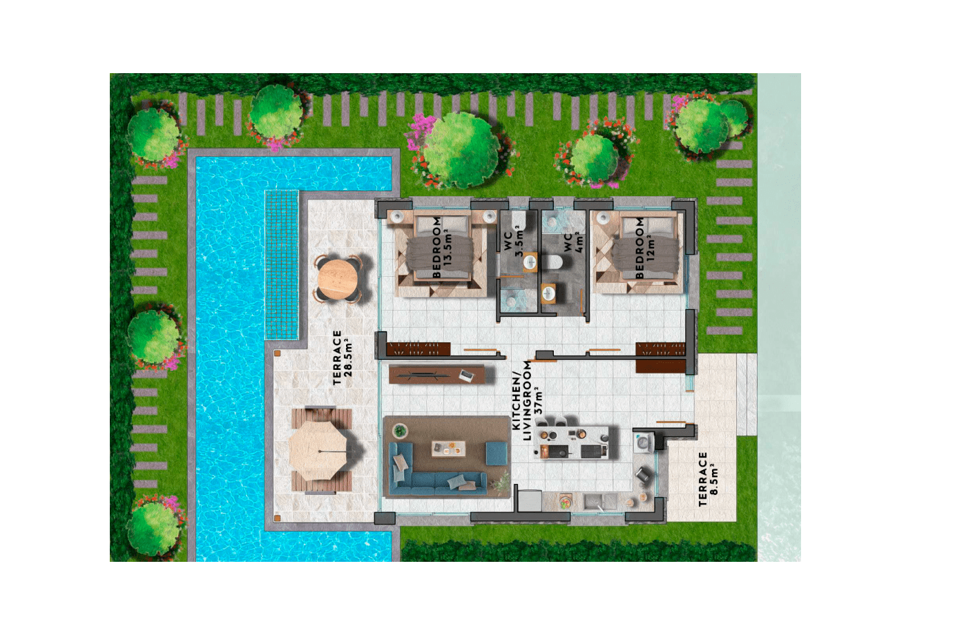 от 344 850£ | | | | | | №3 Уникальный курортный комплекс в Татлысу | | Этот проект станет новой туристической меккой Северного Кипра благодаря своей уникальности. Комплекс будет состоять из апартаментов, пентхаусы в которых будут иместь частный бассейн прямо на крыше. Также проектом предусмотрены бунгало с одной спальней и частным бассейном. | | | | | | | срок сдачи - октябрь 2026 | | | | | | Бунгало 1+1 | | отдельностоящее бунгало площадь 73 м2 патио 12 м2 два санузла частный бассейн 25 м2