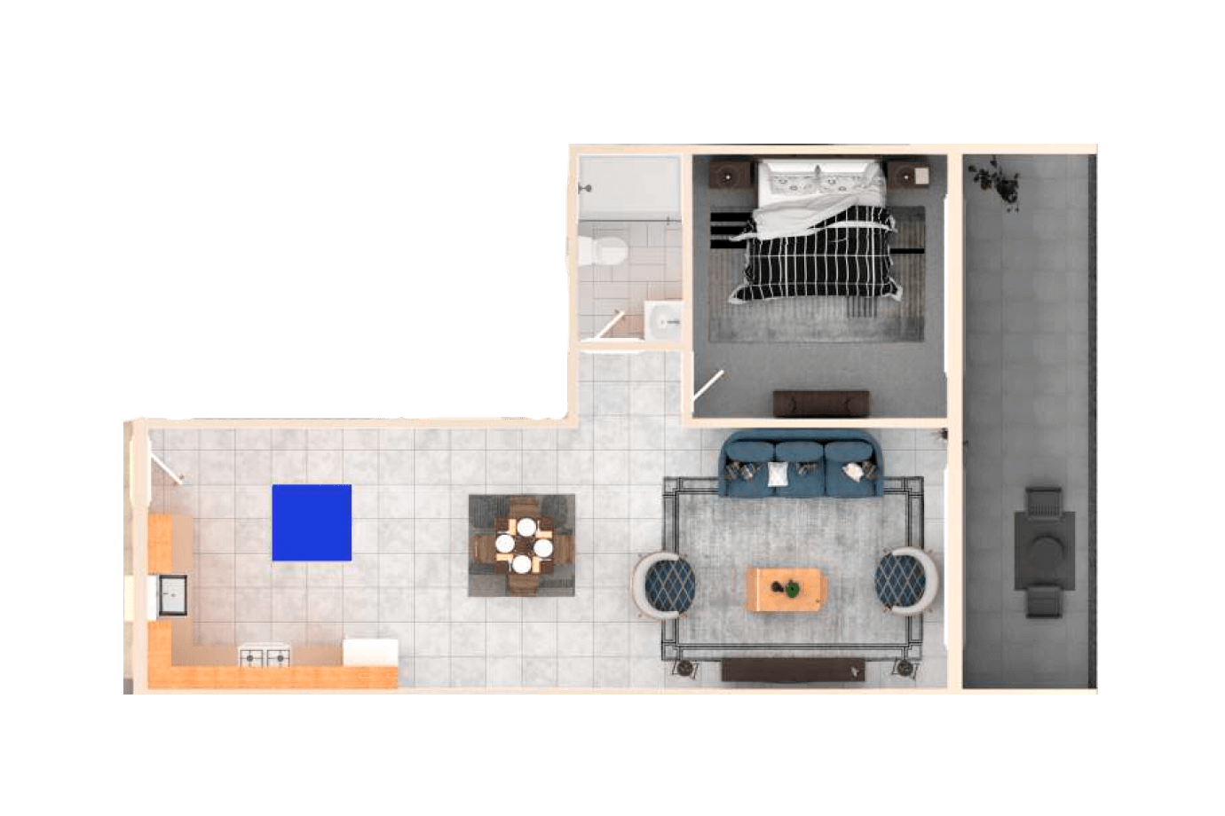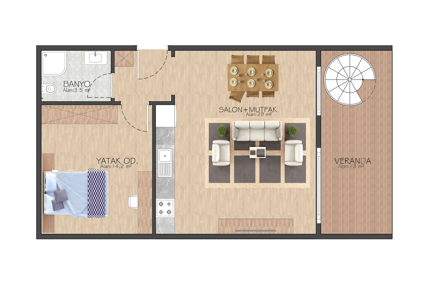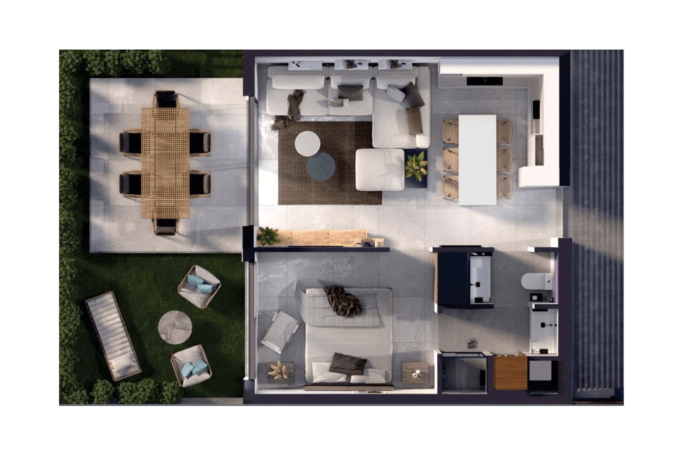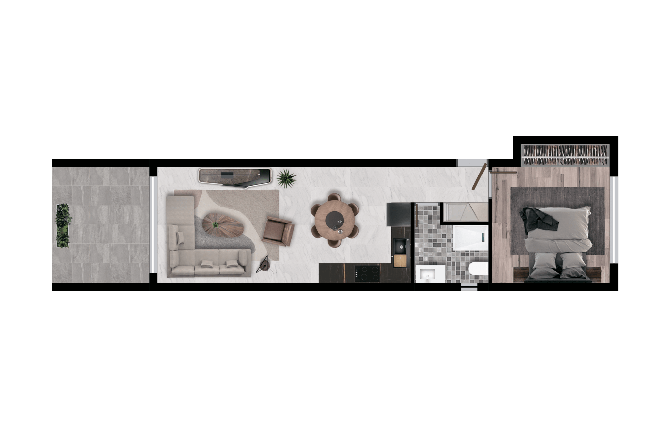 На территории комплекса будет построен большой общий бассейн и разбиты вечнозеленые сады. В быстрой транспортной доступности от проекта находится вся повседневная инфраструктура, включая детские сады, школы и университет. | | | | | | | рассрочка до 24 месяцев под 0% | | | | проект сдается в сентябре 2025 года | | | | | | Апартаменты 1+1 | | 1спальня и кухня-гостиная площадь 55,2 м2 один санузел