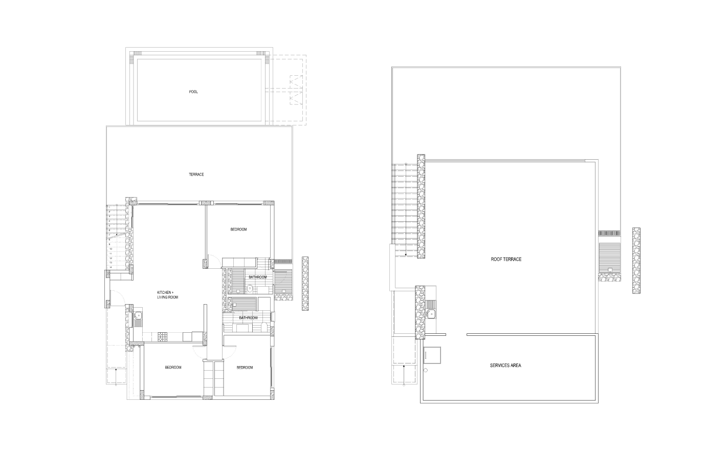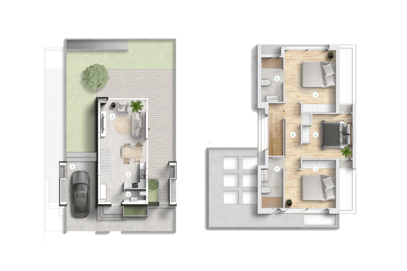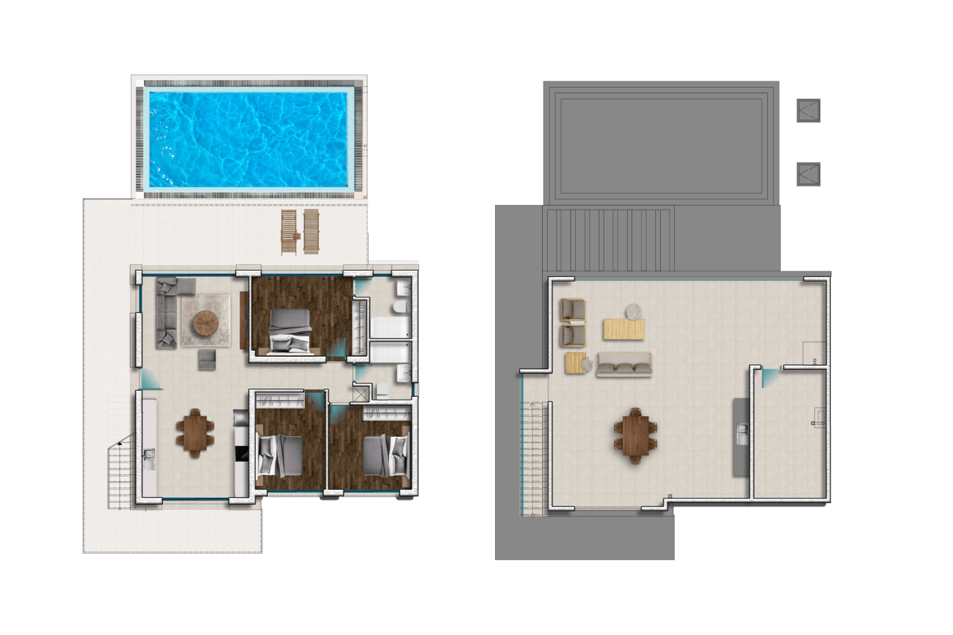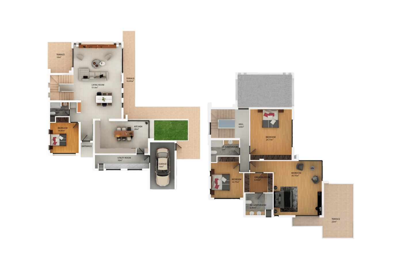 три спальни и кухня-гостиная площадь 130-140 м2 сад 450-550 м2 два санузла терраса на крыше 125-130 м2