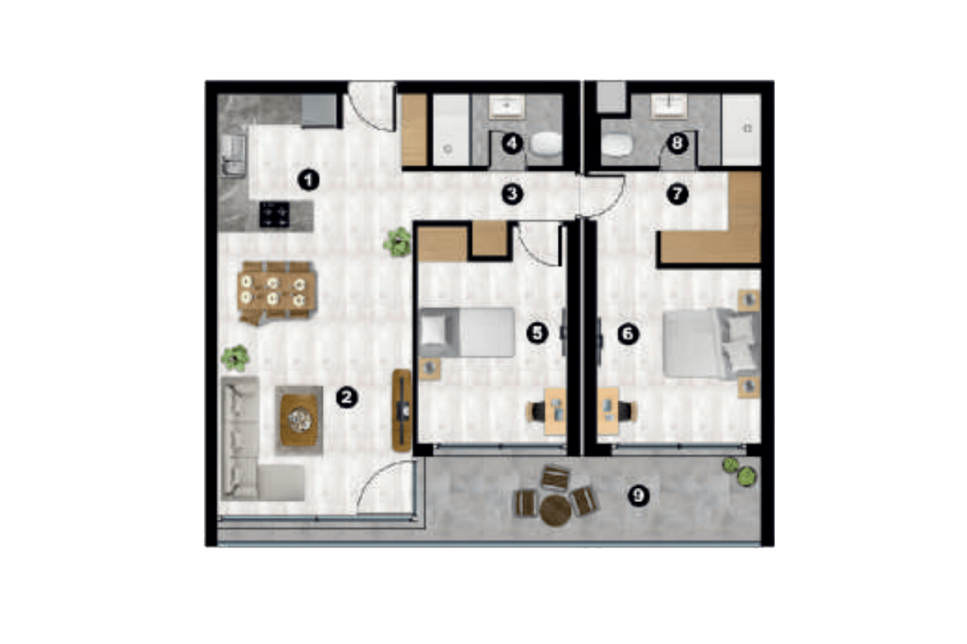 iki yatak odası ve bir mutfak-oturma odası alan 72 - 147 m2 bir banyo