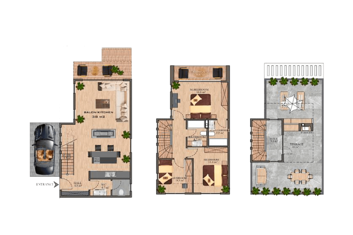 üç yatak odası ve bir mutfak-oturma odası