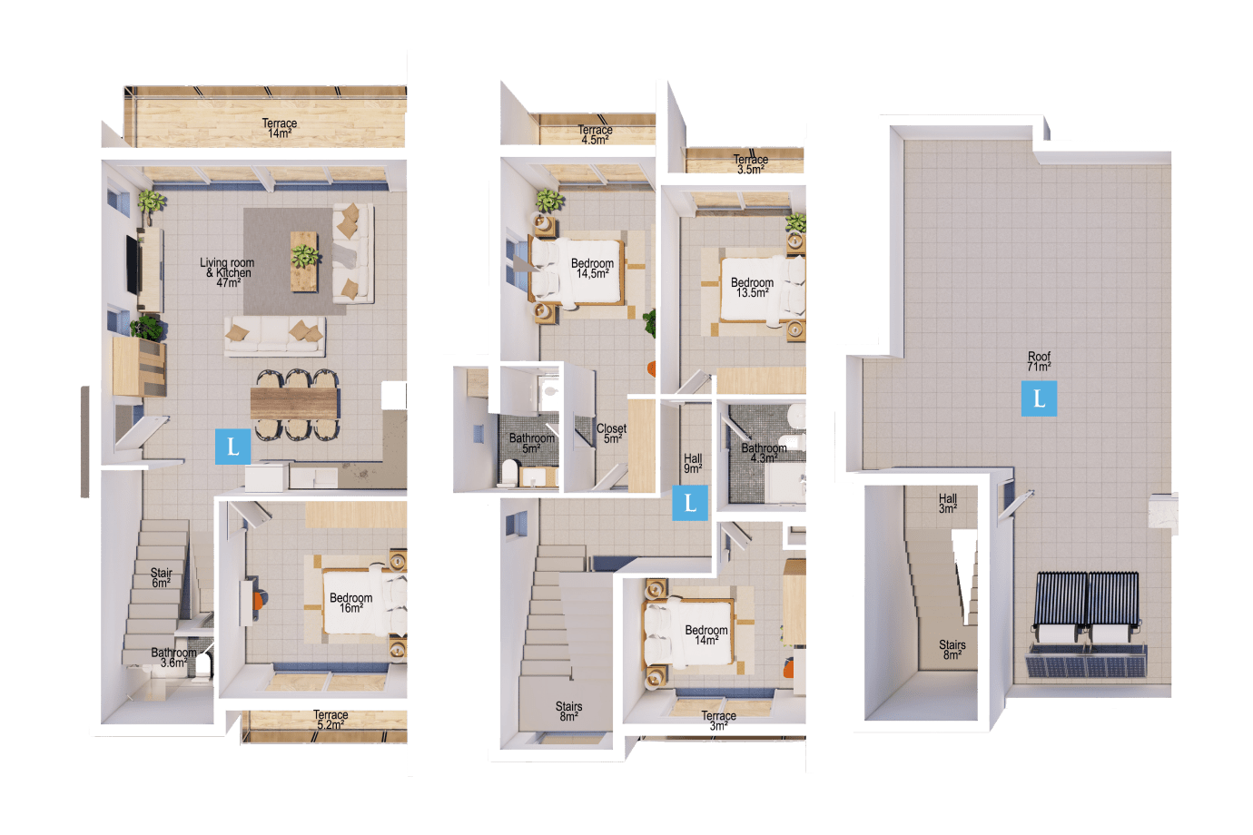 от 290 000£ / 344 700€ | | | | | | Вилла 4+1 | | три спальни и кухня-гостиная площадь 172 м2 три санузла