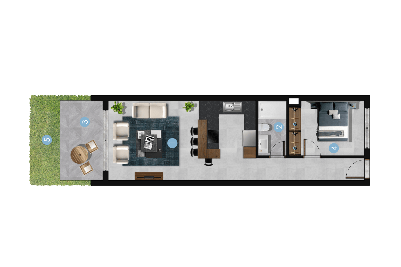 Проект предполагает обширную курортную инфраструктуру, что делает его отличной инвестицией в недвижимость на Средиземном море. Также в этом районе расположен лучший на острове гольф-клуб Korenium. | | | | | | | рассрочка до получения ключей | | | | внутренняя инфраструктура и пешая доступность до моря | | | | срок сдачи - октябрь 2026 года | | | | | | Апартаменты 1+1 | | 1 спальня и кухня-гостиная площадь 42-55 м2 один санузел